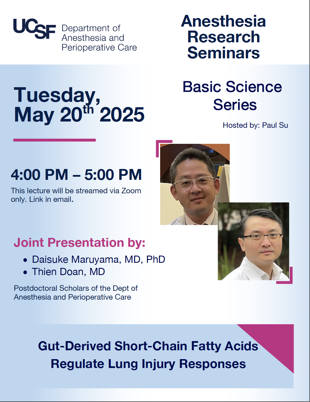 Date Tuesday, May 20, 2025 Time 4:00pm to 5:00pm Location For Zoom link and details contact Alexandra Romero. Speaker(s) UCSF Daisuke Maruyama, MD, PhD Postdoctoral Scholar Thien Doan, MD Postdoctoral Scholar Description Please join us for our next Anesthesia Research Seminar: Basic Science series event, featuring Daisuke Maruyama, MD, PhD, and Thien Doan, MD with their joint lecture titled, “Gut-Derived Short-Chain Fatty Acids Regulate Lung Injury Responses”. Image Type General, Research Audience All Department